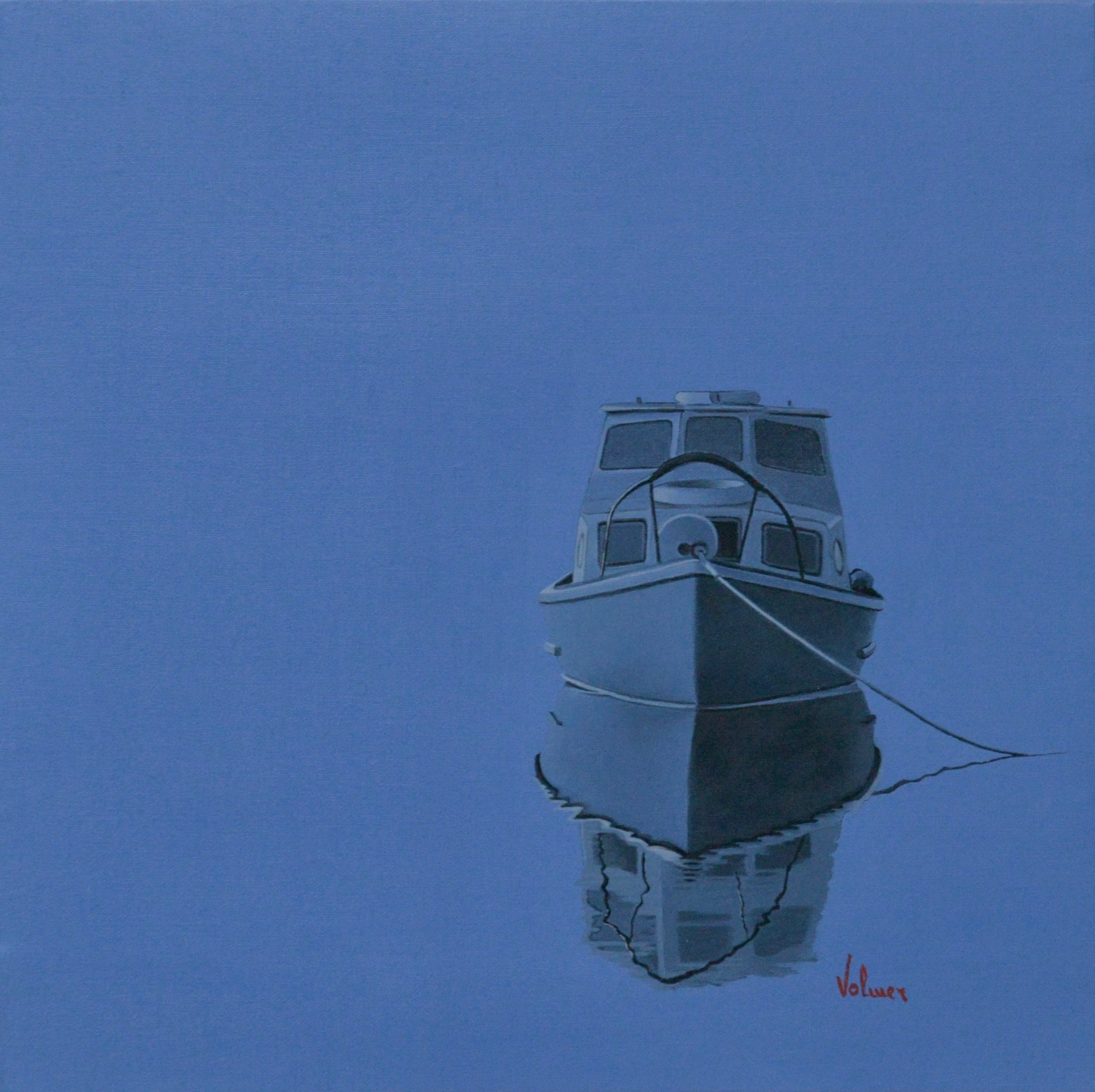 È un'idea che ho sviluppato una ventina d'anni fa, proposta al grande pubblico in occasione della mostra personale del 2003. Il riferimento al "Colore blu del silenzio" è la metafora del mondo ideale in cui noi vorremmo trovarci. La figura rappresentata nei quadri non è collocata centralmente in questo "mondo perfetto" ma è posta di lato, in modo da poter ragionare, riflettere e , quindi, individuare possibili soluzioni rispetto ai problemi che caratterizzano la nostra vita, il nostro mondo che, invece, non è di certo quello ideale. Perché anche noi ogni tanto, all'interno dei nostri vissuti, abbiamo bisogno di metterci in disparte per valutare e capire dove stiamo andando. In tutte le opere che rientrano in questa categoria , c'e la speranza del mezzo di trasporto, spesso la barca, ad indicare il passaggio tra la terraferma e l'acqua.